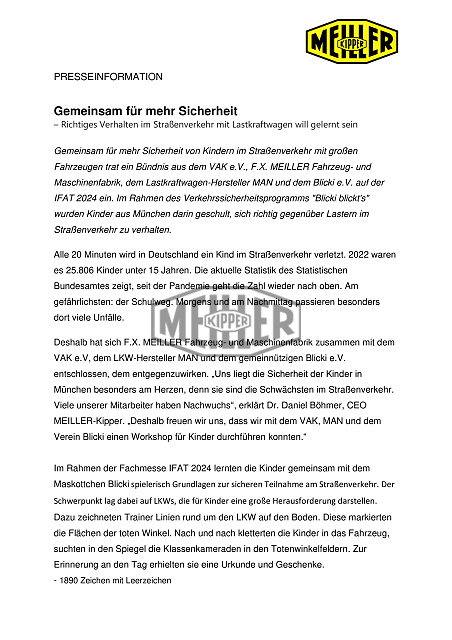 Gemeinsam für mehr Sicherheit von Kindern im Straßenverkehr mit großen Fahrzeugen trat ein Bündnis aus dem VAK e.V., F.X. MEILLER Fahrzeug- und Maschinenfabrik, dem Lastkraftwagen-Hersteller MAN und dem Blicki e.V. auf der IFAT 2024 ein. Im Rahmen des Verkehrssicherheitsprogramms "Blicki blickt's" wurden Kinder aus München darin geschult, sich richtig gegenüber Lastern im Straßenverkehr zu verhalten.